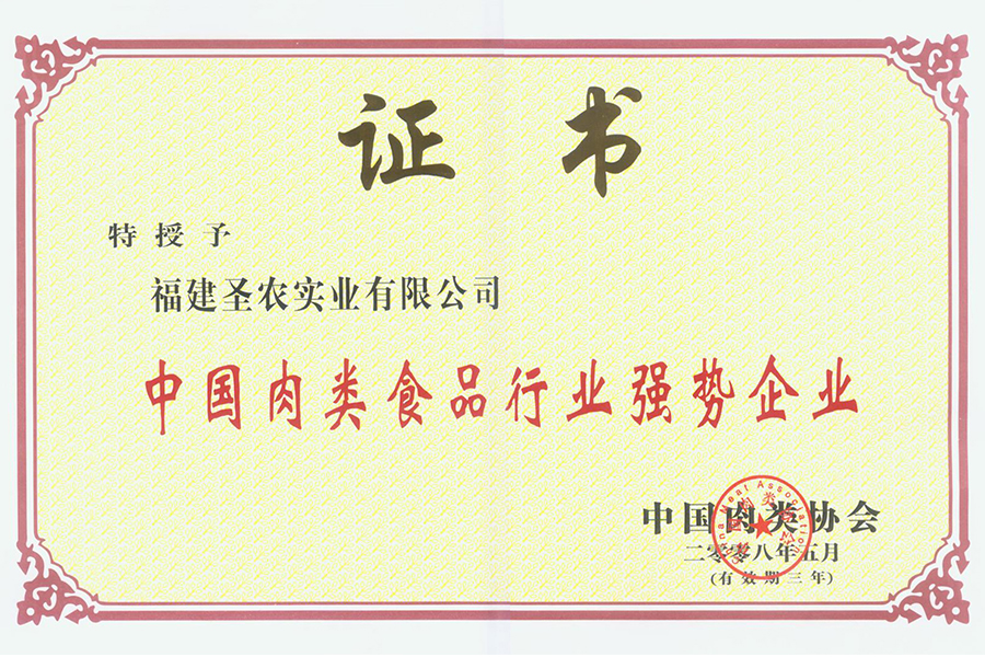 2008年肉類食品行業(yè)強(qiáng)勢(shì)企業(yè)證書