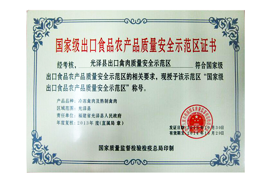2012年國(guó)家級(jí)出口食品農(nóng)產(chǎn)品質(zhì)量安全示范區(qū)證書