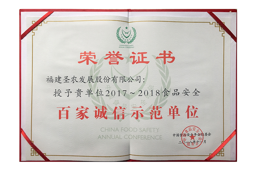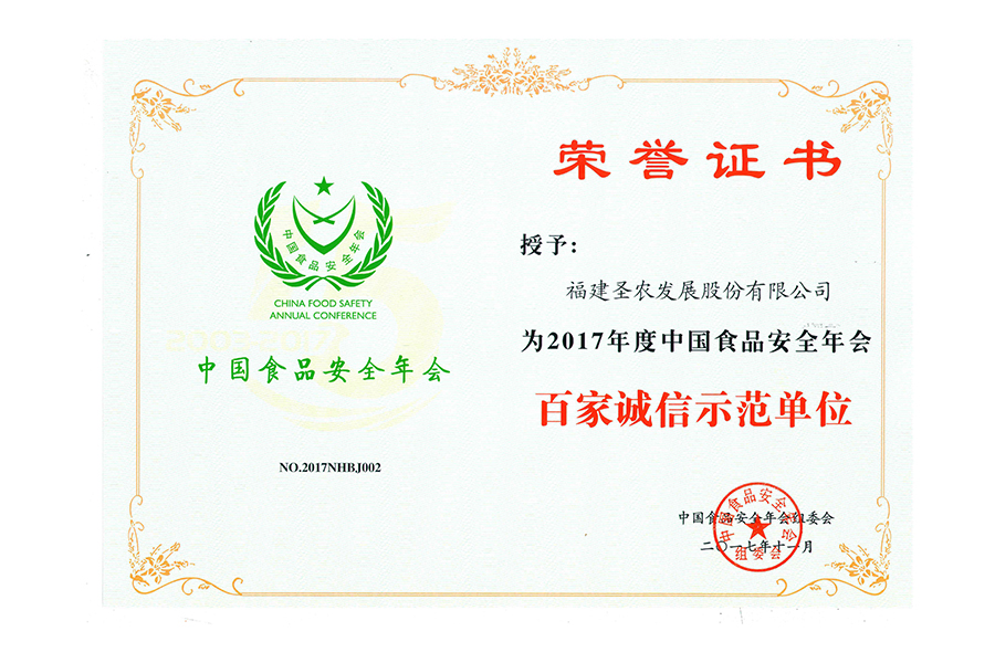 2017年中國(guó)食品安全年會(huì) 百家誠(chéng)信示范單位.證書