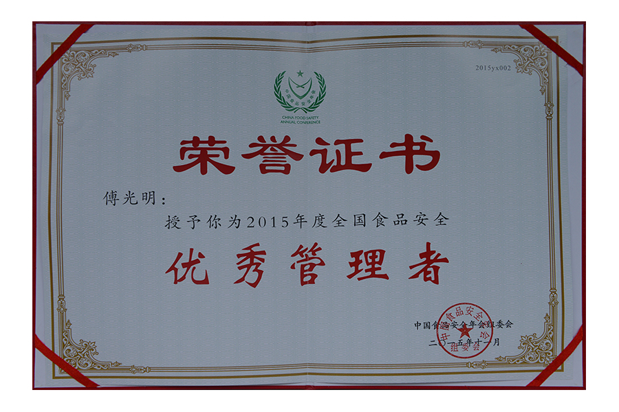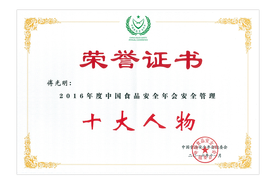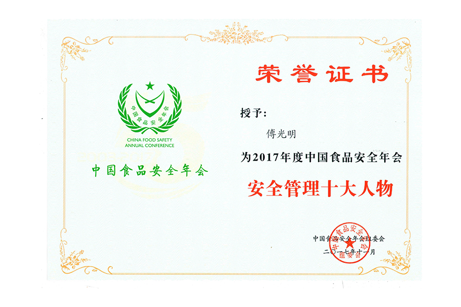 2017年(傅光明)中國(guó)食品安全年會(huì) 安全管理十大人物.證書