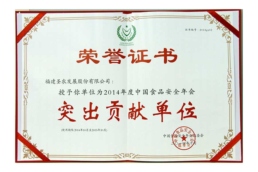 2014年突出貢獻(xiàn)單位證書