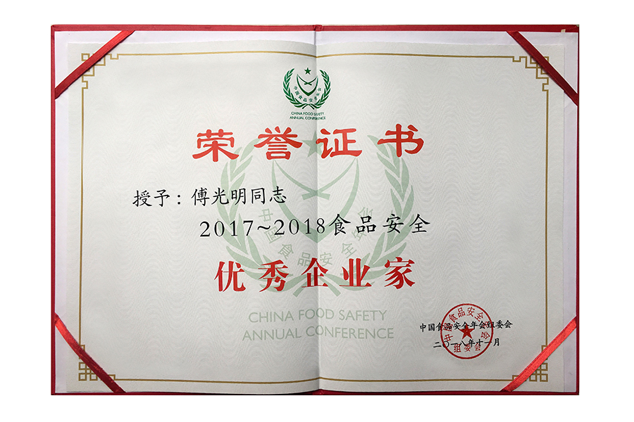 2018食安優(yōu)秀企業(yè)家證書