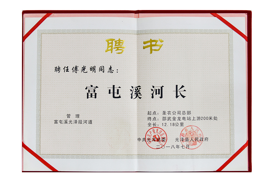 2018年傅光明富屯溪河長(zhǎng)榮譽(yù)證書