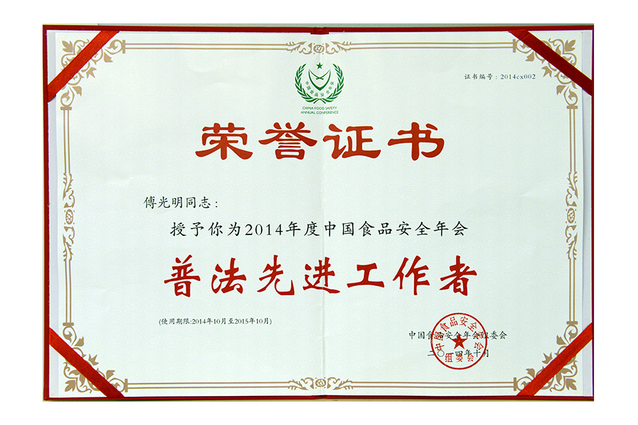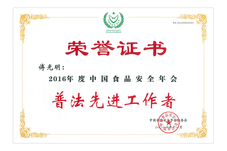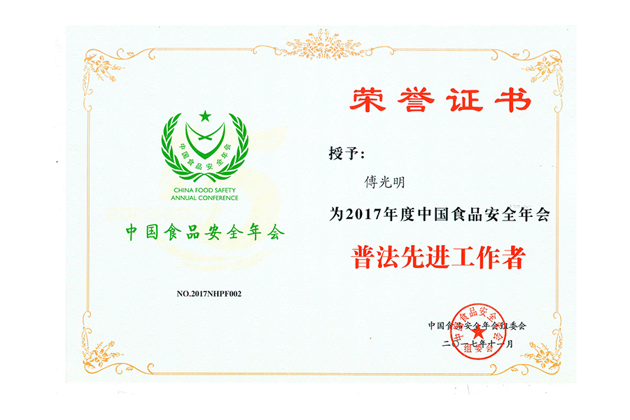 2017年(傅光明)中國(guó)食品安全年會(huì).普法先進(jìn)工作者.北京.證書