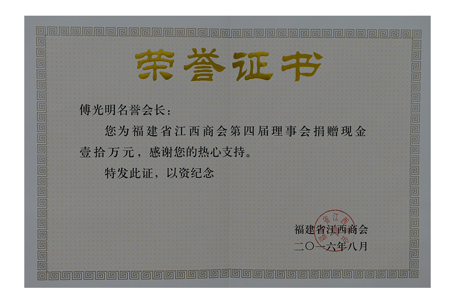 2016年(傅光明)江西商會(huì)捐贈(zèng)10萬(wàn)元證書