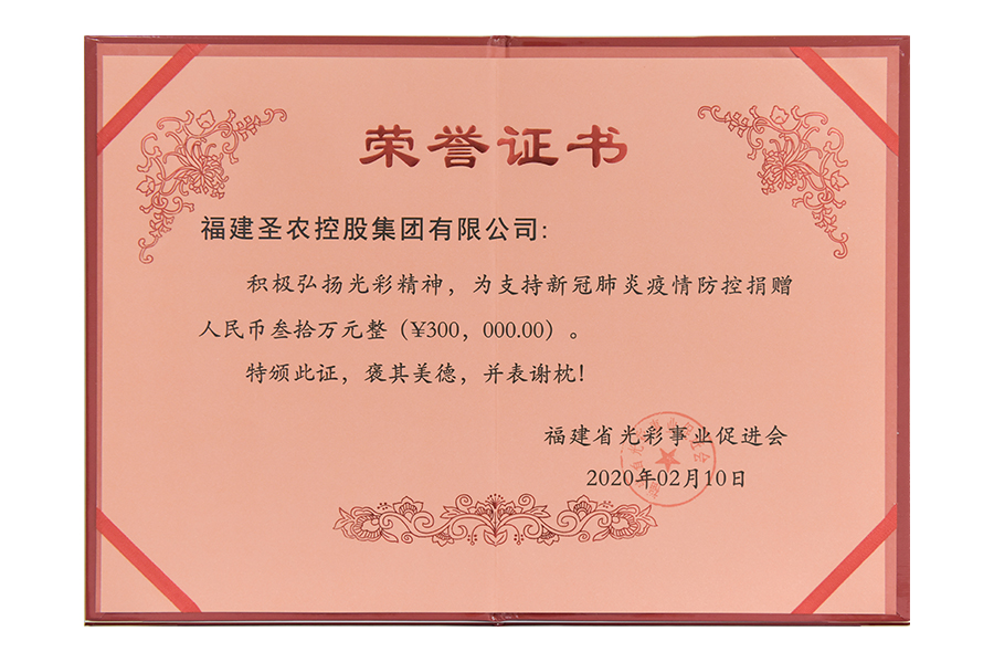 2020年支持新冠疫情防控捐贈(zèng)三十萬(wàn)榮譽(yù)證書
