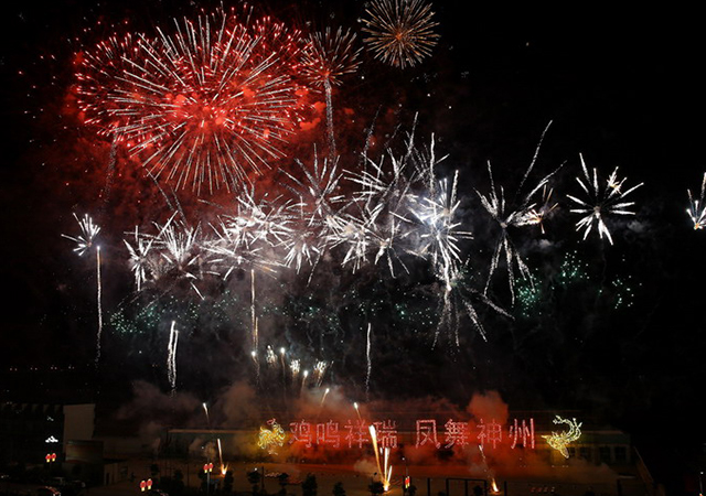 整場焰火晚會分“雞鳴祥瑞鳳舞神州”、“光明圣景”、 “圣農(nóng)騰飛”、“再創(chuàng)輝煌”四個樂章。一條條銀色飛龍在空中漫天飛舞,清脆的鳴叫聲響徹夜空,預示著又一年春天的到來。夢幻神奇的彩色花束,異彩紛呈的光柱,五光十色的焰火,構成一幅幅激情四射、層次分明的動感組合,與圣農(nóng)多姿多彩的夜景交相輝映,給人壯觀震撼而又清純靚麗的感覺。