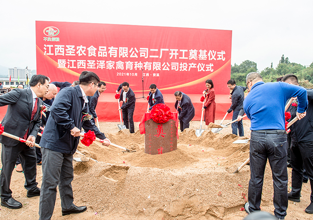 2021年10月18日上午,圣農(nóng)食品十廠開工暨資溪祖代種雞場(chǎng)投產(chǎn)儀式在資溪舉行。圣農(nóng)發(fā)展股份有限公司董事長(zhǎng)傅光明、常務(wù)副總裁陳劍華、周紅,副總裁肖凡,資溪縣委書記吳淑珍參加了儀式,撫州市委副書記李高興下達(dá)開工令。